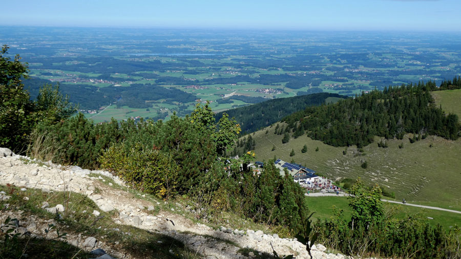 und die vielen Wirtshäuser und Hütten auf dem Almengebiet 200 Meter unter den Felsspitzen der Kampenwand laden schon am