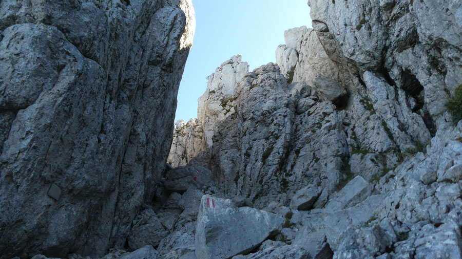öffnet sich die Felsflucht der Kaisersäle. Hier gilt es ein paar Kraxelstellen und Engpässe zu überwinden, bis man unter dem
