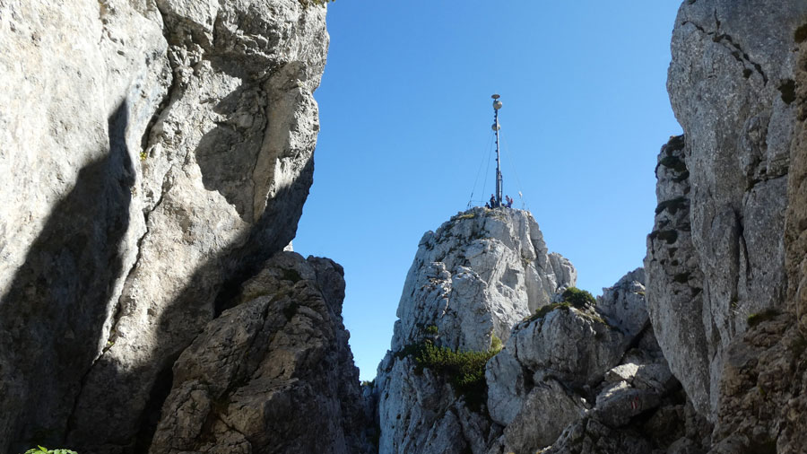 dem Gipfel vorbei, dann steigt man von Osten über Felsen hinauf zu einer Stahlbrücke, die die Scharte zum Gipfel und dem 12