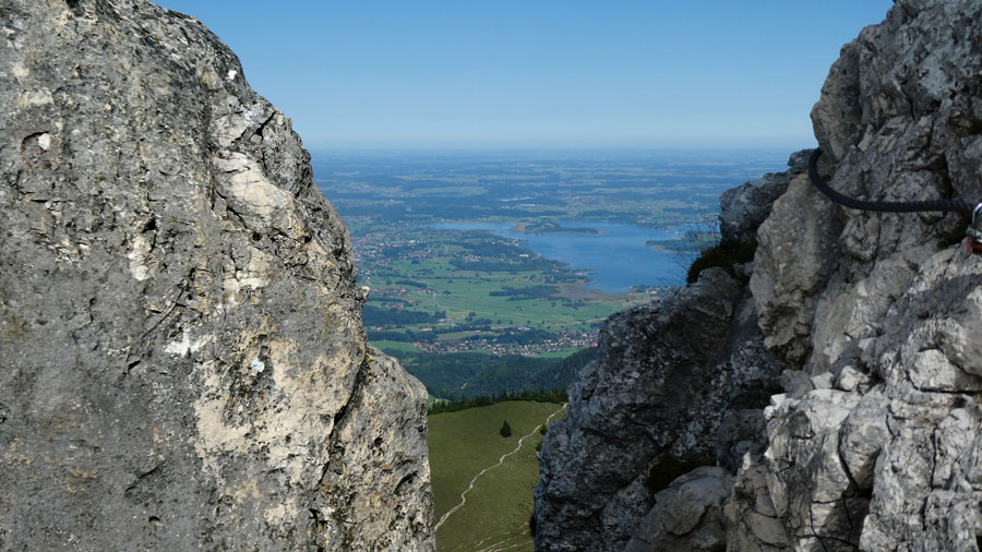 Felsturm des Ostgipfels auf einer Art Vorplatz kurz verschnaufen kann. Ein mit Drahtseil gesicherter Quergang führt unter