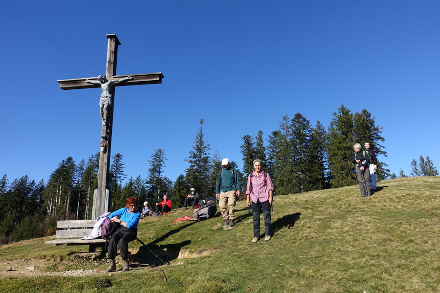 Beim Gipfelkreuz, oberhalb der Alm mit Blick zu den Tegernseer Bergen lassen wir uns unsere Gipfelbrotzeit schmecken.