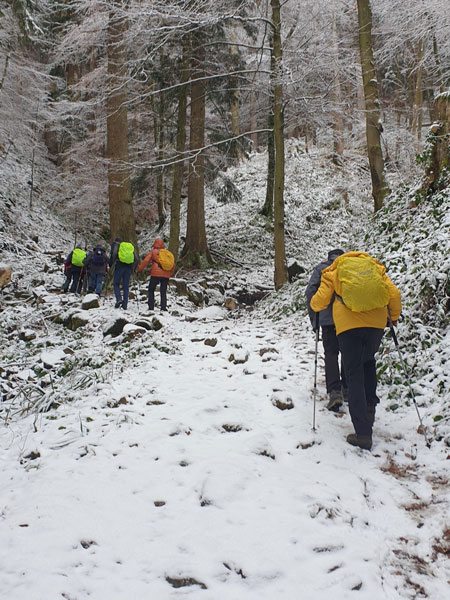 Vom Bahnhof in Hausham gehen wir zunächst durch den Ort. Ein paar Zentimeter Neuschnee begleiten uns. Von einer