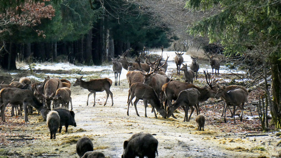 weiter bei der Wildfütterung sehen wir, wie sich einige Wildschein-Rotten am frisch ausgebrachten Futter bedienen.