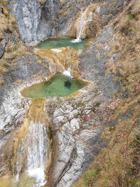 Über den Reitberg (962 m) steigen wir ab und überqueren auf einer schmalen Holzbrücke den mehrstufigen Wasserfall mit