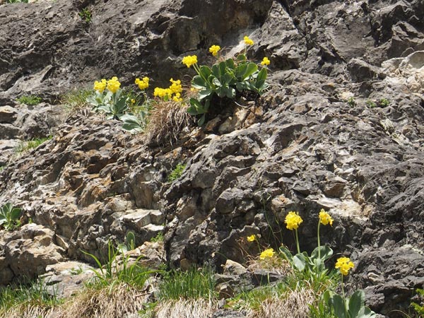 Laubwald. An einer Felswand kurz unter dem Gipfel blühten viele Felsaurikeln („Gamsbleame“).