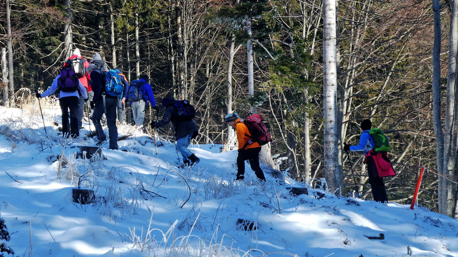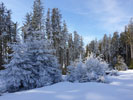 verlassen um weiter zum Zielmoos zu gelangen. Kurz vor dem Gipfel des Rohnberg sind die Bäume schattenseitig winterlich verreift.