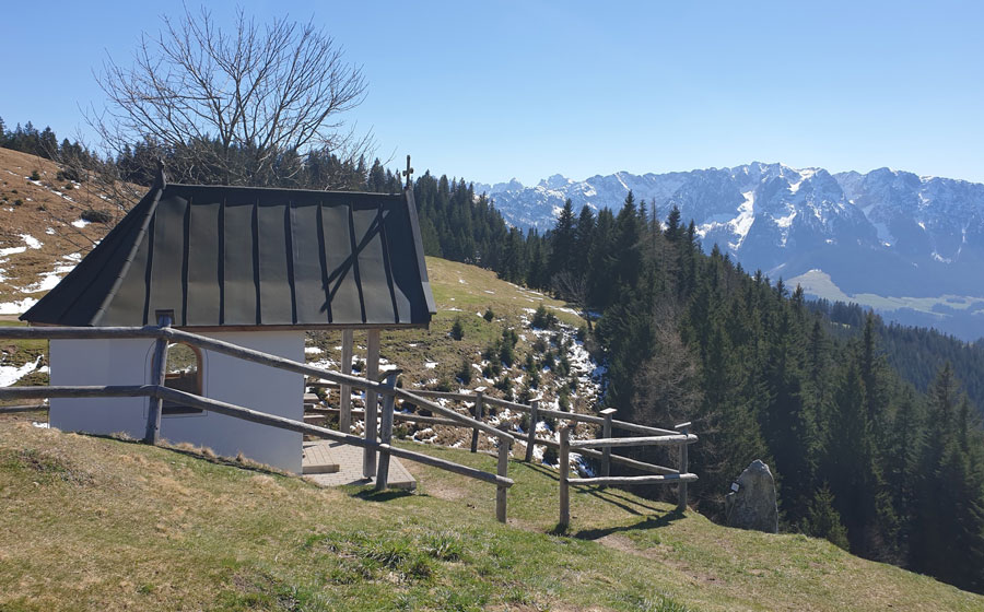 bringt uns zur Karspitze (1229 m) mit Kreuz und kleiner Kapelle. Nach einer kurzen Gipfelpause schlendern wir weiter über die