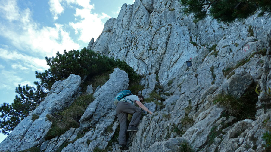 Felsturm des Ostgipfels auf einer Art Vorplatz kurz verschnaufen kann. Ein mit Drahtseil gesicherter Quergang führt unter