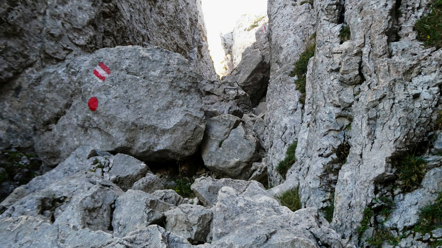 öffnet sich die Felsflucht der Kaisersäle. Hier gilt es ein paar Kraxelstellen und Engpässe zu überwinden, bis man unter dem