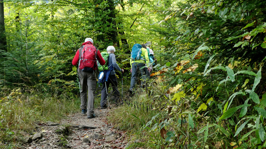 Ein mäßig steiler Steig, der immer wieder durch Waldpassagen und über Weideflächen führt und