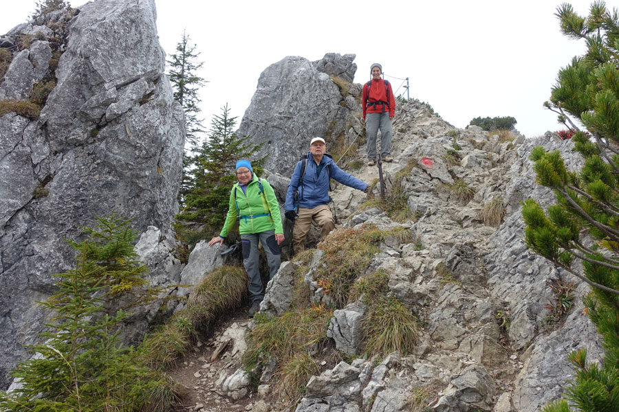 Eine Hand voll begibt sich noch auf den teilweise mit Stahlseilen versicherten Steig über den Kamm zum Ostgipfel der
