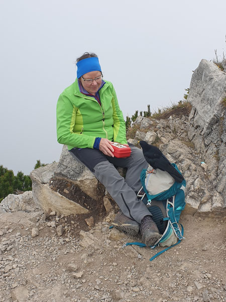 Ein Teil der Gruppe macht in einer windgeschützten Senke Brotzeit und steigt zur Oberen Firstalm zu Kaffee und Kuchen ab.