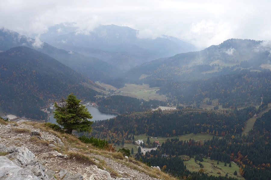 Den dicken Nebel haben wir unter uns gelassen; aber ein paar Nebelschwaden wabern noch über dem Spitzingsee. Über uns ist