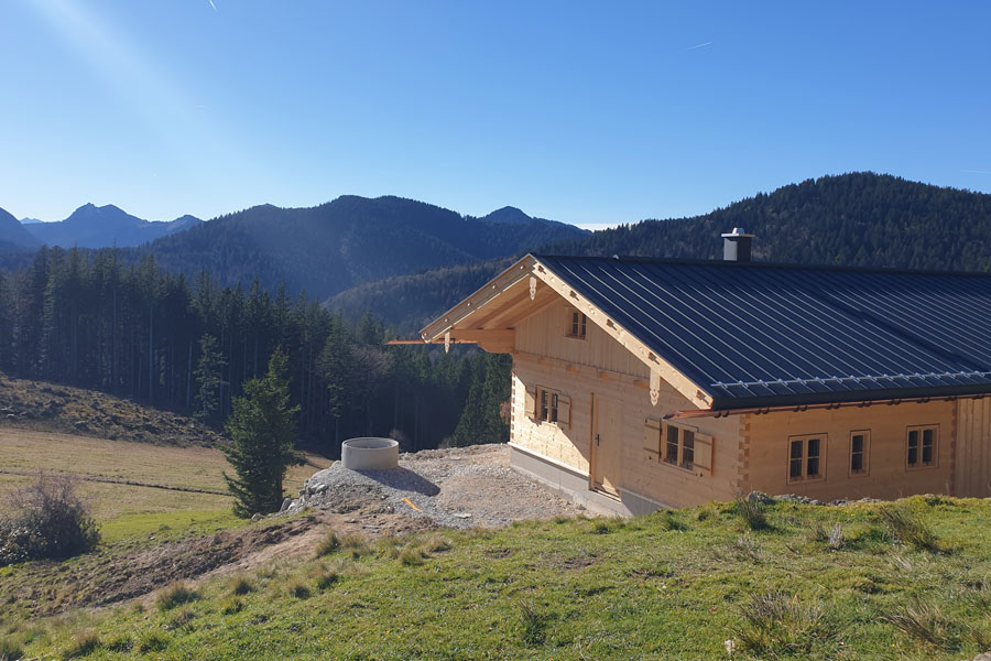 Wiesengelände mit der neu erbauten Holzeralm. Die ehemalige über 100 Jahre alte Hütte musste 2018 wegen starkem Pilzbefall