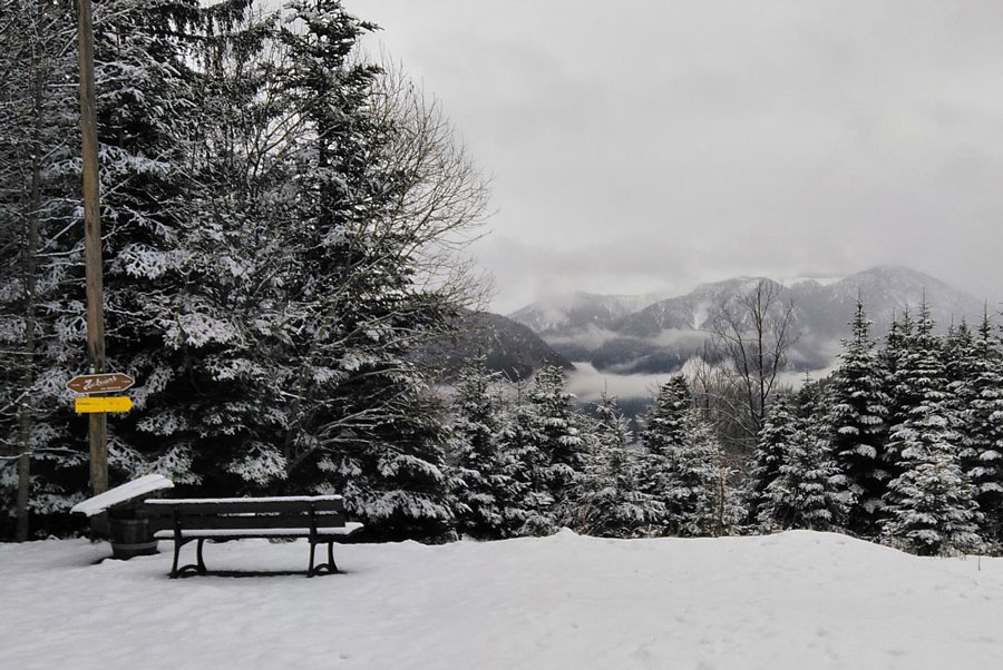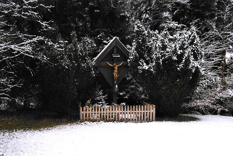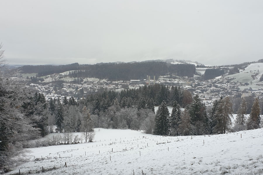 Vom Bahnhof in Hausham gehen wir zunächst durch den Ort. Ein paar Zentimeter Neuschnee begleiten uns. Von einer
