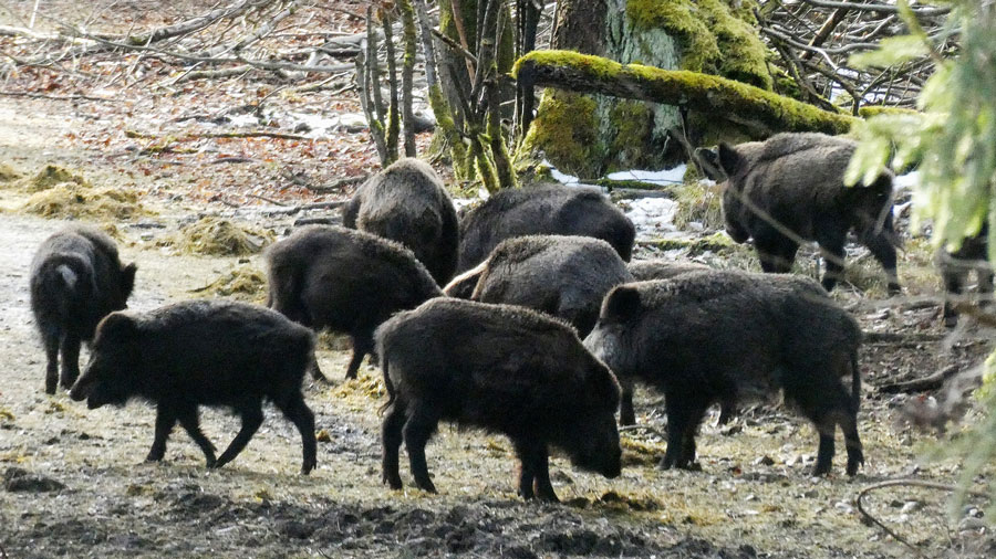 weiter bei der Wildfütterung sehen wir, wie sich einige Wildschein-Rotten am frisch ausgebrachten Futter bedienen.