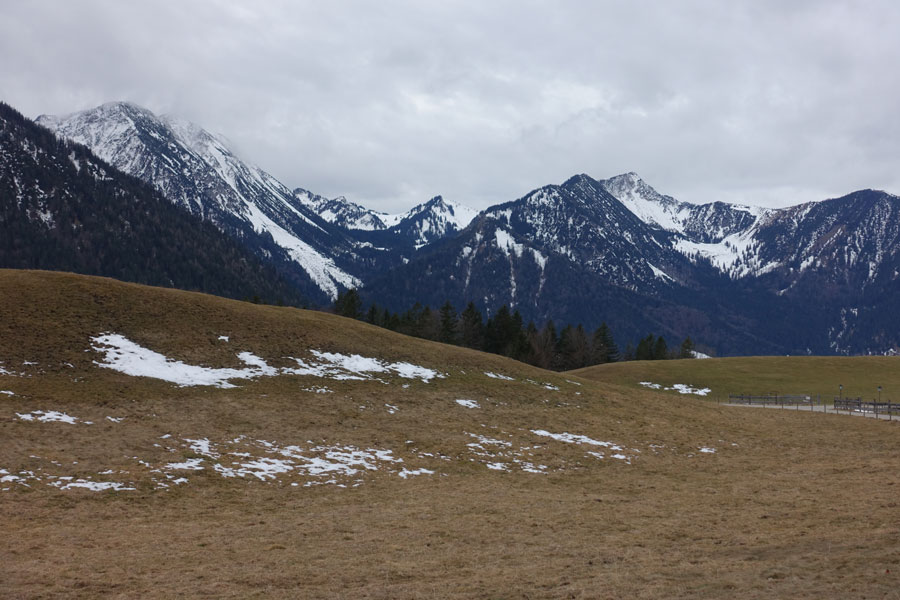 Schnee- und eisfrei geht es bergauf nach Hochkreut auf 959 Meter. Der Gasthof ist zur Zeit im Winterschlaf. Wir machen